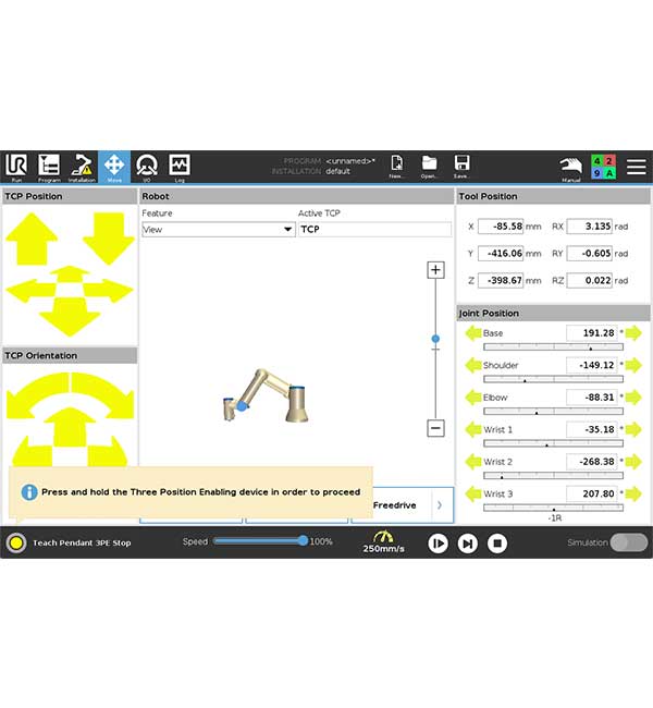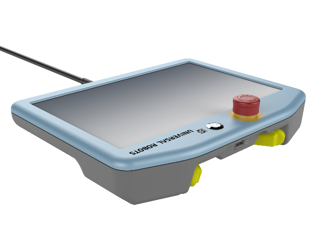 Der 3PE Teach Pendant von Universal Robots ist ein Bedienpanel mit Zustimmtaster und eine Alternative zum Standard Teach Pendant der e-Serie. Es ist kompatibel mit allen Robotern der e-Serie, ergonomisch gestaltet und kann mit der rechten oder linken Hand einfach bedient werden. Die Freedrive-Taste wurde durch einen einfachen Ein-Knopf-Zugriff auf Freedrive ersetzt.