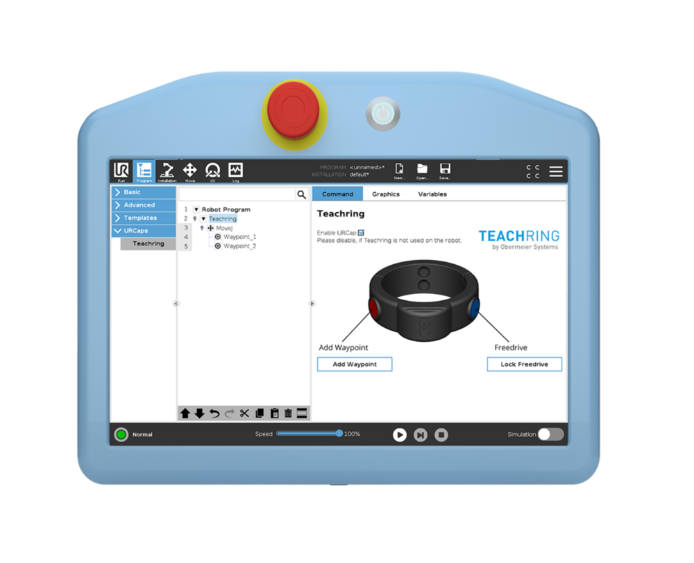 Er ist einfach zu montieren und intuitiv über die UR Cap bedienbar. Der Teachring hat zwei Knöpfe. Mit der einen Taste wird der Freedrive aktiviert. So lässt sich der Roboter von Hand zur gewünschte Position bewegen. Wird die zweite Taste betätigt, speichert der Teachring den Wegpunkt über die Teachring UR Cap direkt in das Roboterprogramm.